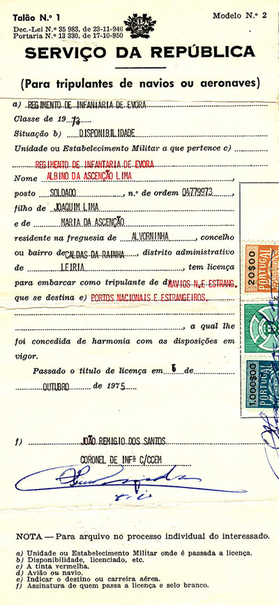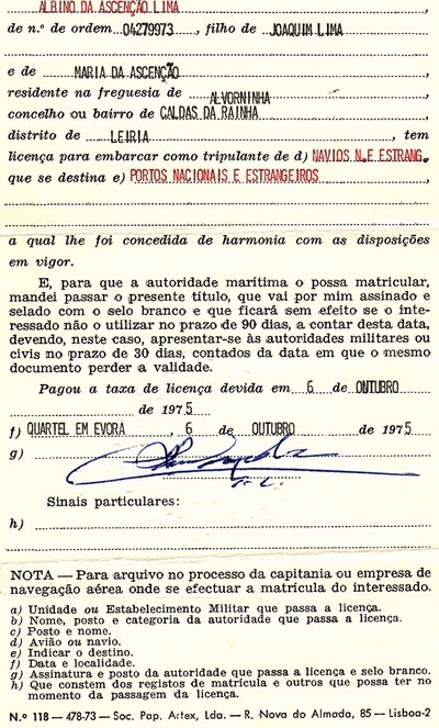 È claro que cada um seguiu o seu caminho, uns procuraram nova vida e outros como no meu caso procurei o serviço que tinha quando me chamaram para o serviço militar, eu tinha um mês para me apresentar ao serviço, da empresa de onde saíra, mas como o meu serviço era marítimo, sabia que quando me apresentasse poderia ser colocado num navio e partir de imediato para uma viagem mais ou menos longa, então apeteceu-me ficar mais uns dias em casa e o que é que eu fiz, emendei a data da licença militar para poder embarcar.